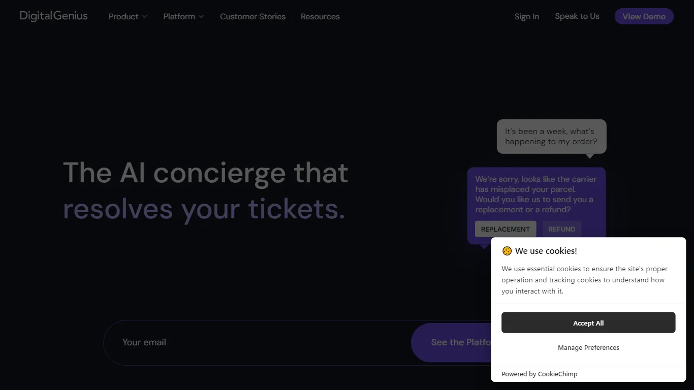 DigitalGenius é o concierge de IA para marcas de comércio eletrônico que resolve seus tickets de atendimento ao cliente, economiza dinheiro e encanta seus clientes.