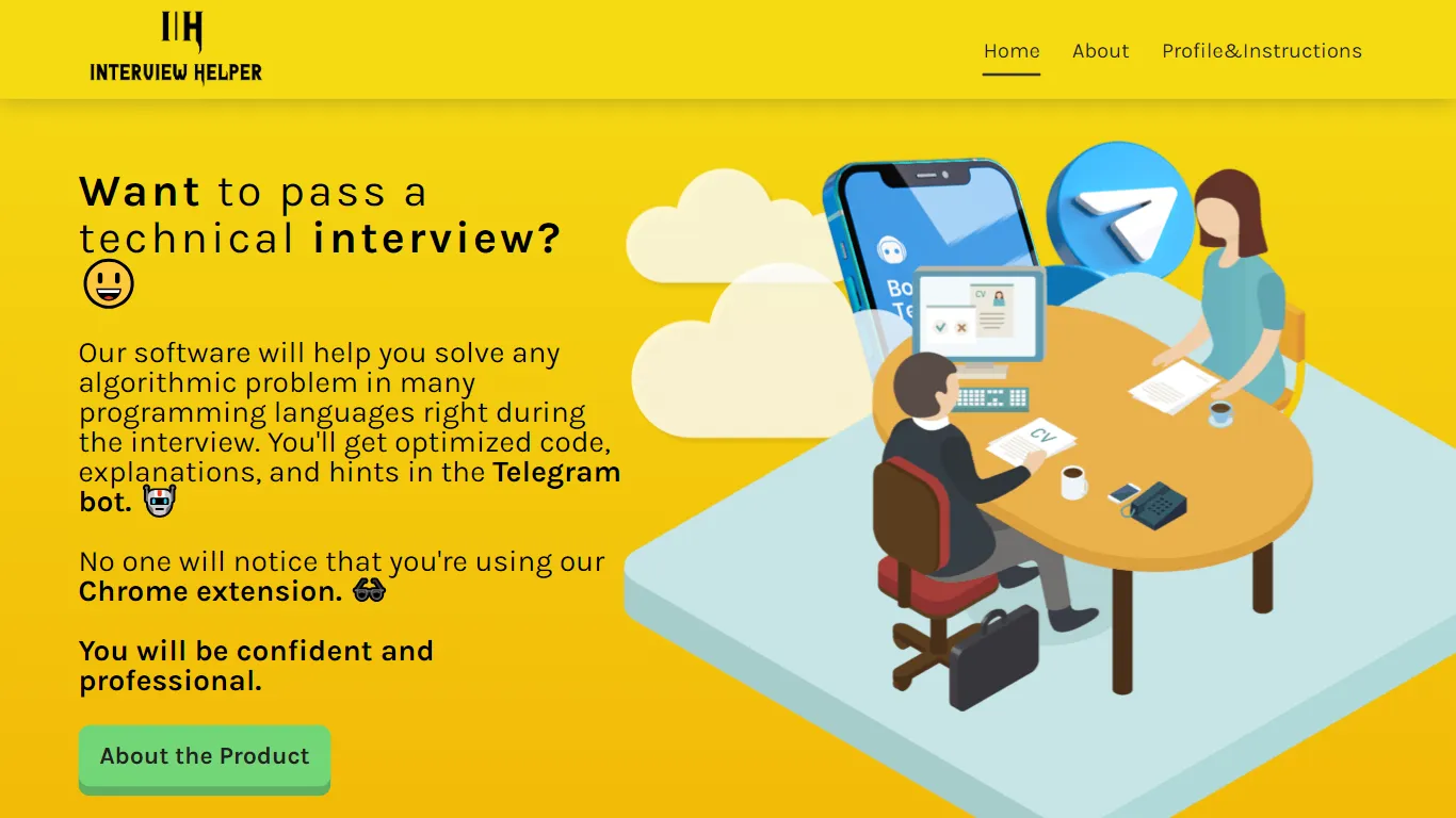 Interview Helper [JSProEdition] é uma ferramenta de software criada para ajudar indivíduos a se destacarem em entrevistas técnicas, resolvendo problemas algorítmicos em várias linguagens de programação. Ele foi projetado principalmente para aqueles que estão passando por avaliações técnicas ou de codificação com possíveis empregadores. Ele fornece código otimizado, explicações e orientações por meio de um bot do Telegram. Esta ferramenta permite que as interações do usuário ocorram em tempo real em meio a um cenário de entrevista ao vivo, sem que observadores externos percebam seu uso. Outro recurso importante desta ferramenta é sua extensão para Chrome. Como complemento do navegador, os usuários podem usar a ferramenta perfeitamente, sem chamar a atenção, mantendo assim seu profissionalismo e aumentando sutilmente sua confiança durante as entrevistas. A extensão do Chrome facilita a navegação, o uso e alimenta informações adaptadas às necessidades do usuário. Como compromisso com a segurança e a privacidade, o Interview Helper [JSProEdition] segue uma política de privacidade rigorosa. Isso aborda as preocupações dos usuários sobre como suas informações são armazenadas, usadas e protegidas pelo software. O produto visa encontrar o equilíbrio entre o desempenho assistido em entrevistas técnicas e o respeito à privacidade do usuário. Embora o foco principal da ferramenta seja a preparação de entrevistas e assistência em tempo real, suas funcionalidades também podem ser relevantes entre indivíduos que buscam melhorar seus problemas de maneira geral. habilidades de resolução em programação. Pode servir como uma ferramenta de estudo complementar com a ajuda de suas soluções e explicações compiladas.