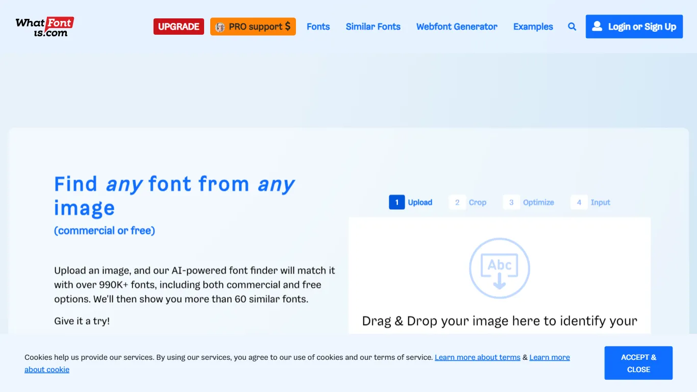 O Font Finder do What Font Is é uma ferramenta alimentada por inteligência artificial que ajuda os usuários a identificar fontes de qualquer imagem. Possui um catálogo de mais de 900.000 fontes indexadas, que podem ser comerciais ou gratuitas. Os usuários carregam uma imagem desejada, escolhem a fonte necessária e a ferramenta exibe mais de 60 fontes semelhantes, para download ou compra.